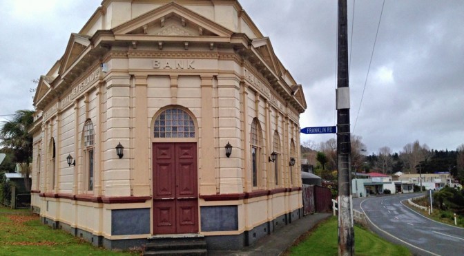 I got the bike of the back and went for a toodle into the Paparoa village for a look around. The Pub is just around the corner and the village is loaded with history. There is a river which comes up from the Kaipara which was used to get supplies up for the locals and dragged up a bank by wires from the boats. The old National Bank building is built into the shape of the corner which is interesting too.