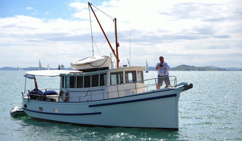 image December 5, 2016 1024 × 599 The Classic Yacht Christmas invasion at Patio Bay, Waiheke Island The start boat Wild Duck with Tony on the bow