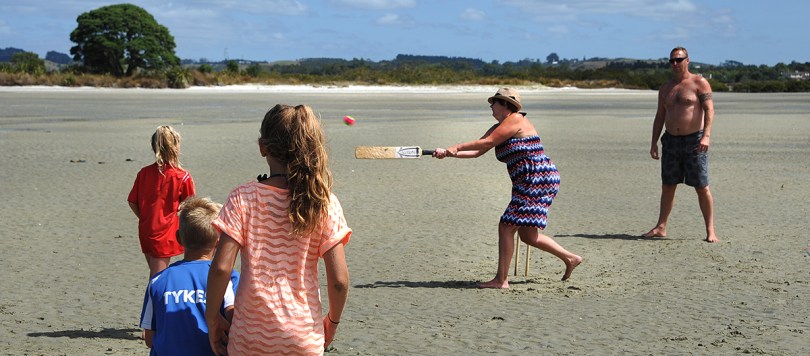 Whangateau January 31, 2017 1200 × 528 In the Sun! A Whangaparoa family with their English friends playing cricket.