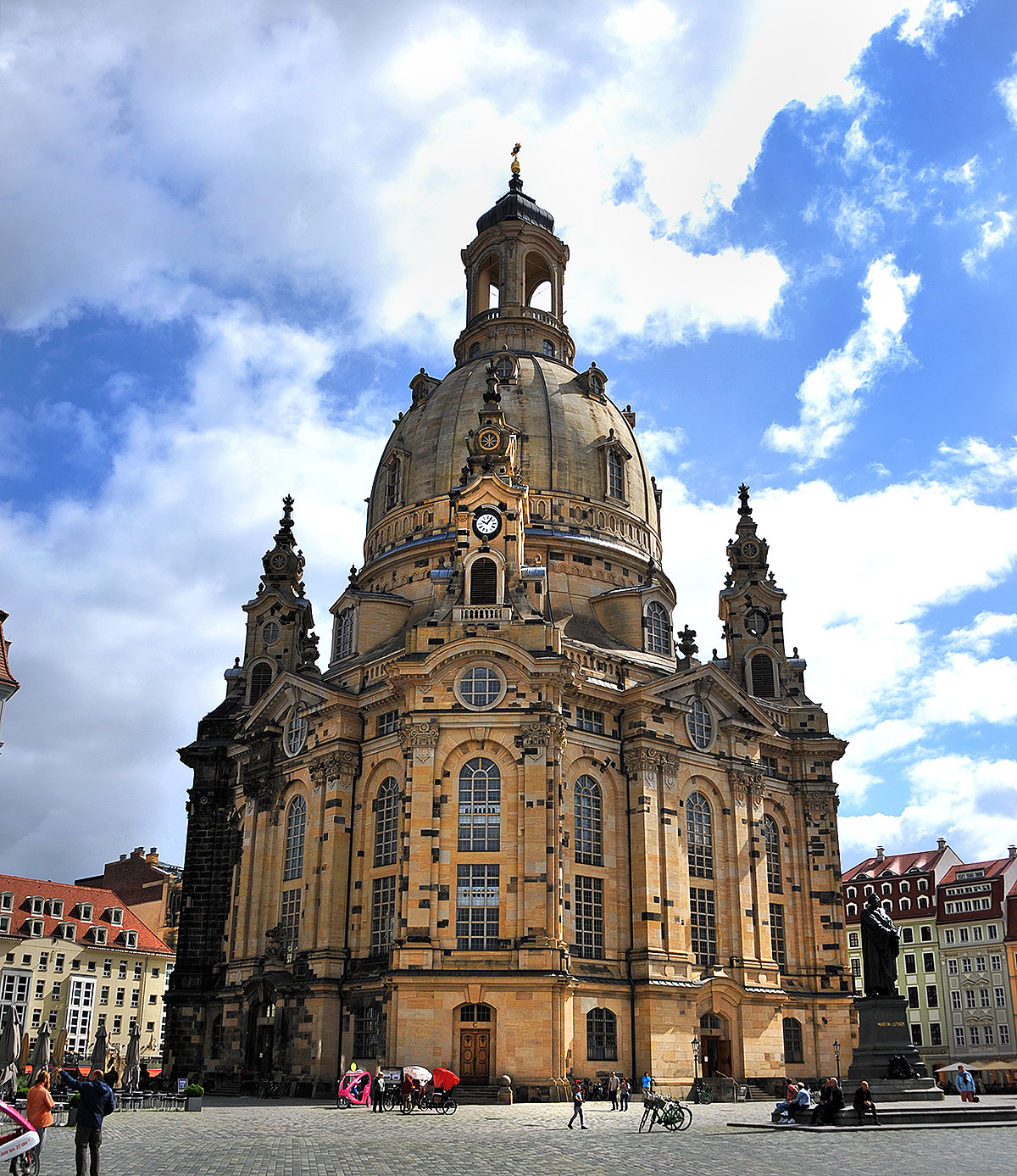 dresden July 16, 2017 1200 × 1387 A City Rebuilt The outside of the cathedral. Note the dark stones on the left. The rest are new!