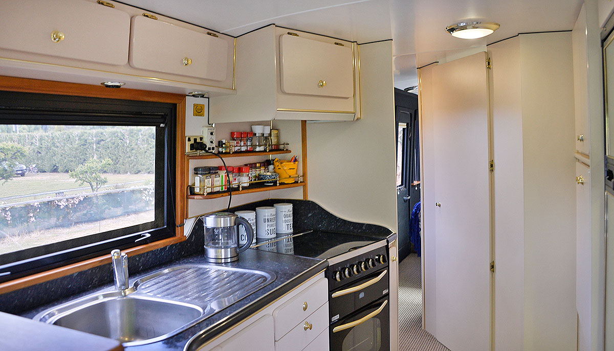The inside furnishings are all leather and he has a couple of TV’s nicely positioned partly in a great drinks cabinet and one in the bedroom.