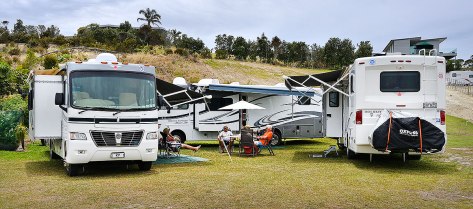 As they pulled up beside Rafe, there was a whir of engines with the Hydraulic rams levelling them up, the slideouts coming out and the awnings rolling out. All of them at the same time ! This is Motorhoming the easy way 🙂