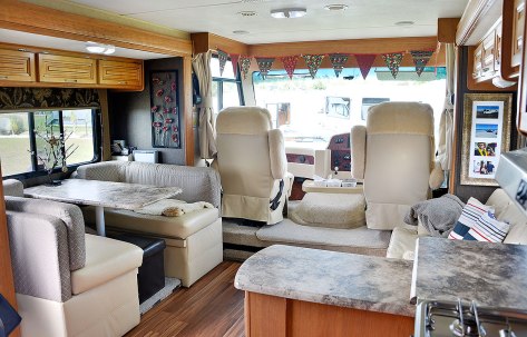 They’re 10 metres long with centre island beds on a 9 ton ticket. They all have slide outs which makes them huge inside. The décor is very similar with the only difference being that Mike’s has a bigger single slideout on one side.