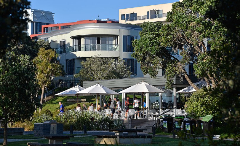 milford January 19, 2018 1200 × 730 Early Magic in Auckland Takapuna beach café opposite the campground
