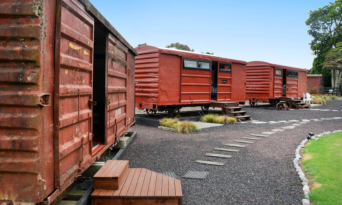Noeline has been collecting and doing up old Railway Wagons for about 4 years and now has 4 of them set up for accomodation. There is also a Kitchen, Shower and Toilet all looking like a stattion and railway station side buildings. The whole place is immaculatly tidy and clean quite cleverly set out.