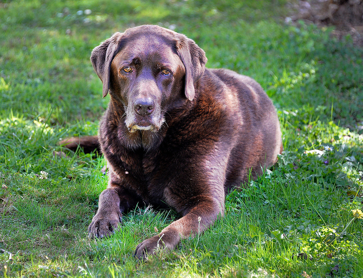 Family choccy lab Olive in the shade