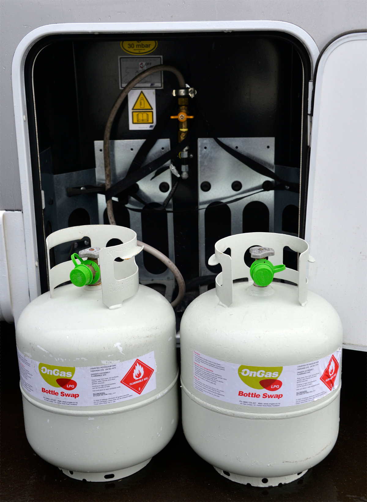 All ready to be put in the Gas locker. Note the rubber ring on the base.I thought I’d give one a run and see how they went. The whole process from start to finish took me about ten minutes and once I’d set it up for two 9kg bottles in NZ, it looked like the perfect solution to prevent middle of the night alarms from the fridge, when a bottle has run out, usually in the rain 🙂