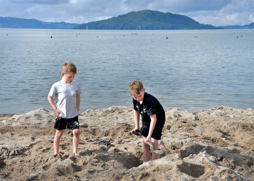 rotorua October 17, 2019 1200 × 856 Grandchildren and Rotorua The boys digging with Mokoia Island behind