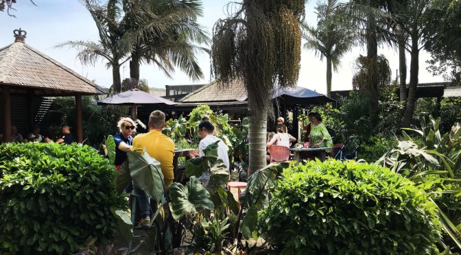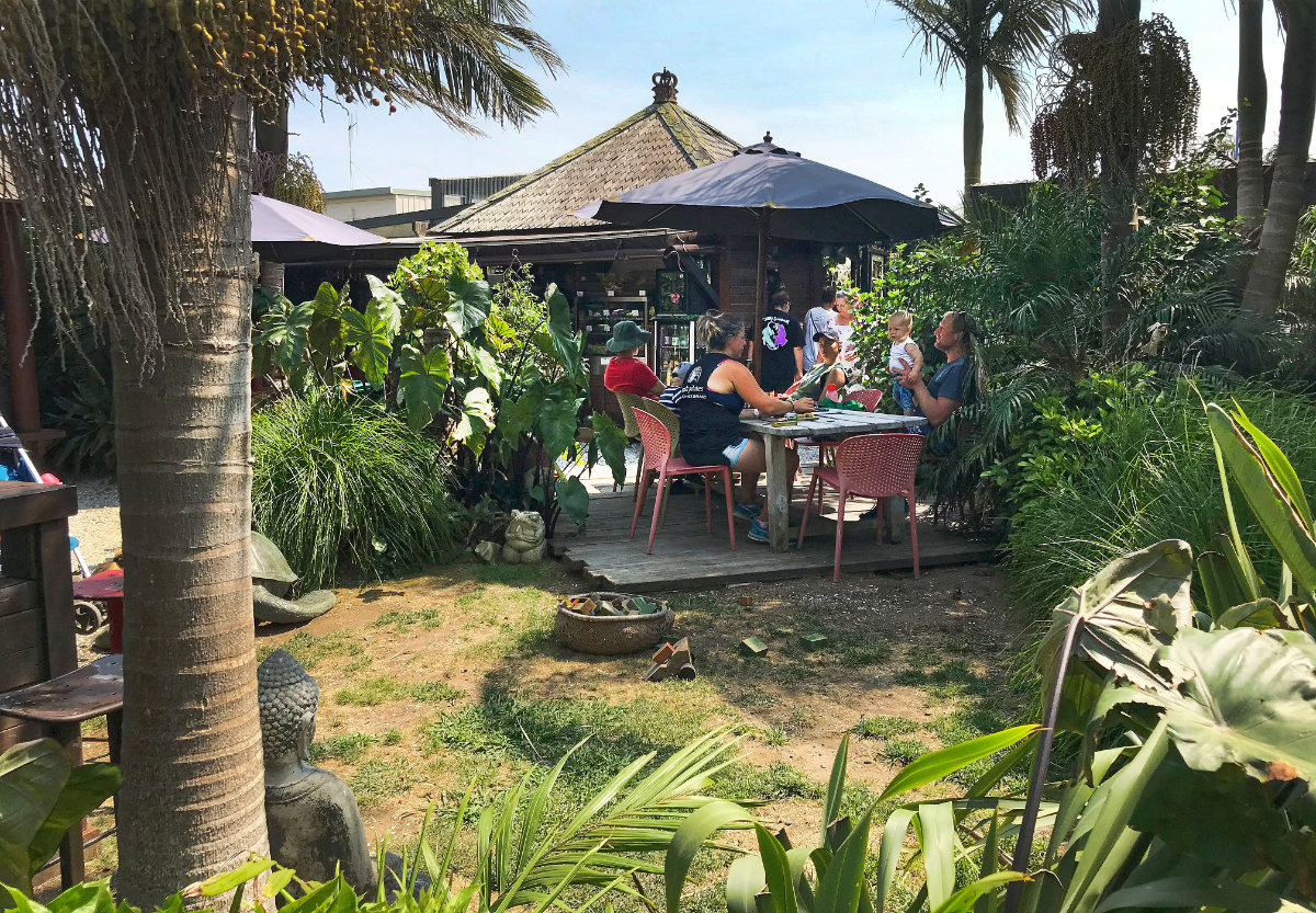 Fiona found a setup called the Pod which is a group of Bure like buildings amongst a very pacific inspired garden which serves fantastic food and coffee. It also has a few shops in there too in separate buildings. Its on the left as you ride into the shops.