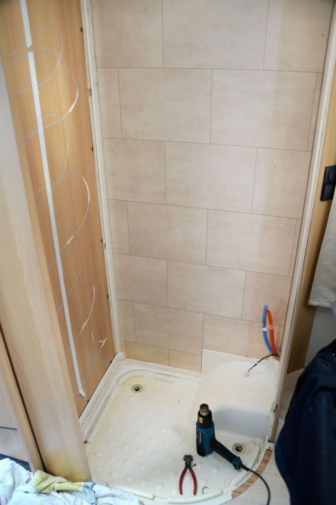 It wasn’t a simple job as all the lining had to be removed to get the old shower tray out and to complicate matters, our bedroom TV was bolted through one of the shower linings up high so that had to come off too.