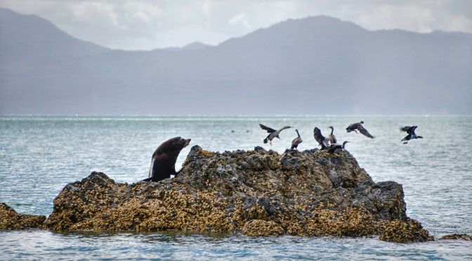 While I was just watching the antics of the Shags sitting on the rocks, there was some movement in the water nearby. It was a Seal who climbed up on the rock ruining the Shag’s day 🙂 He was now King of the Castle.. Andrew told me later that he’s been coming to the beach for years every year since he was a pup.