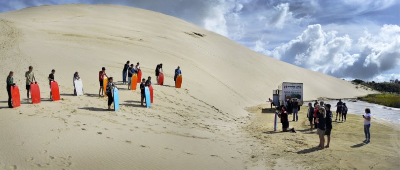 pano sandhill April 19, 2023 1200 × 512 Bus Trip up Ninety Mile Beach – Cape Reinga Jason doing the safety briefing before they head up the dune.
