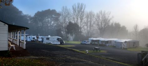 Cabins at the back, motorhome parking and pools down below.. in the fog!