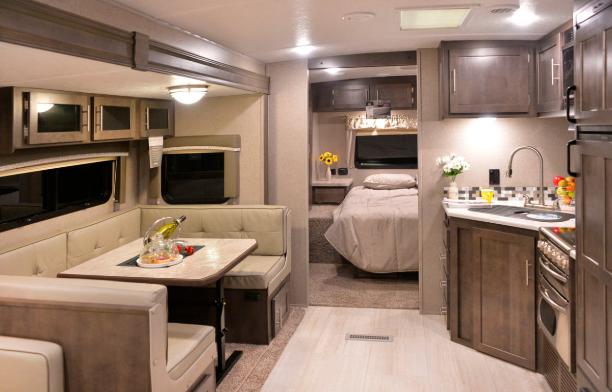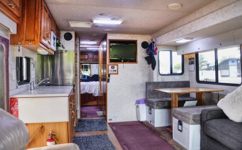 It is setup with a huge paddock like living room behind the drivers area with lounge and dining area on one side opposite the Kitchen. The ablutions off a corridor to the bedroom at the back.