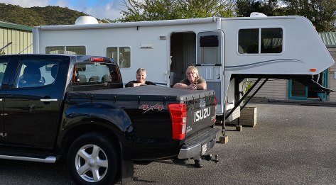 Early in the morning, Keith and Lyn rocked up in their 5th Wheeler and with minimal fuss, backed it into a nice big park in the Central RV park in Greymouth.
