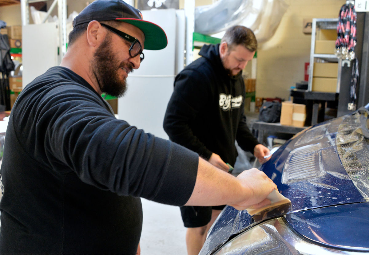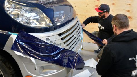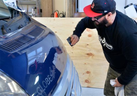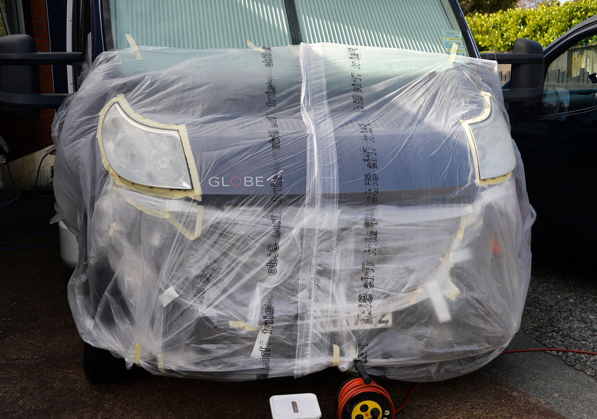 Scott arrived right on time and parked right next to Rafe and immediately set about masking up the headlights and covering the front of the van with plastic to protect the van from muck and overspray.