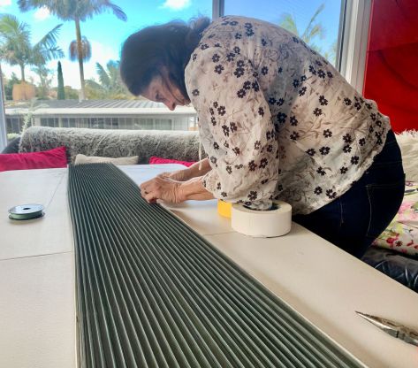 On goes the blueApplying the blue over the white.Jeremy trimming the blue shape