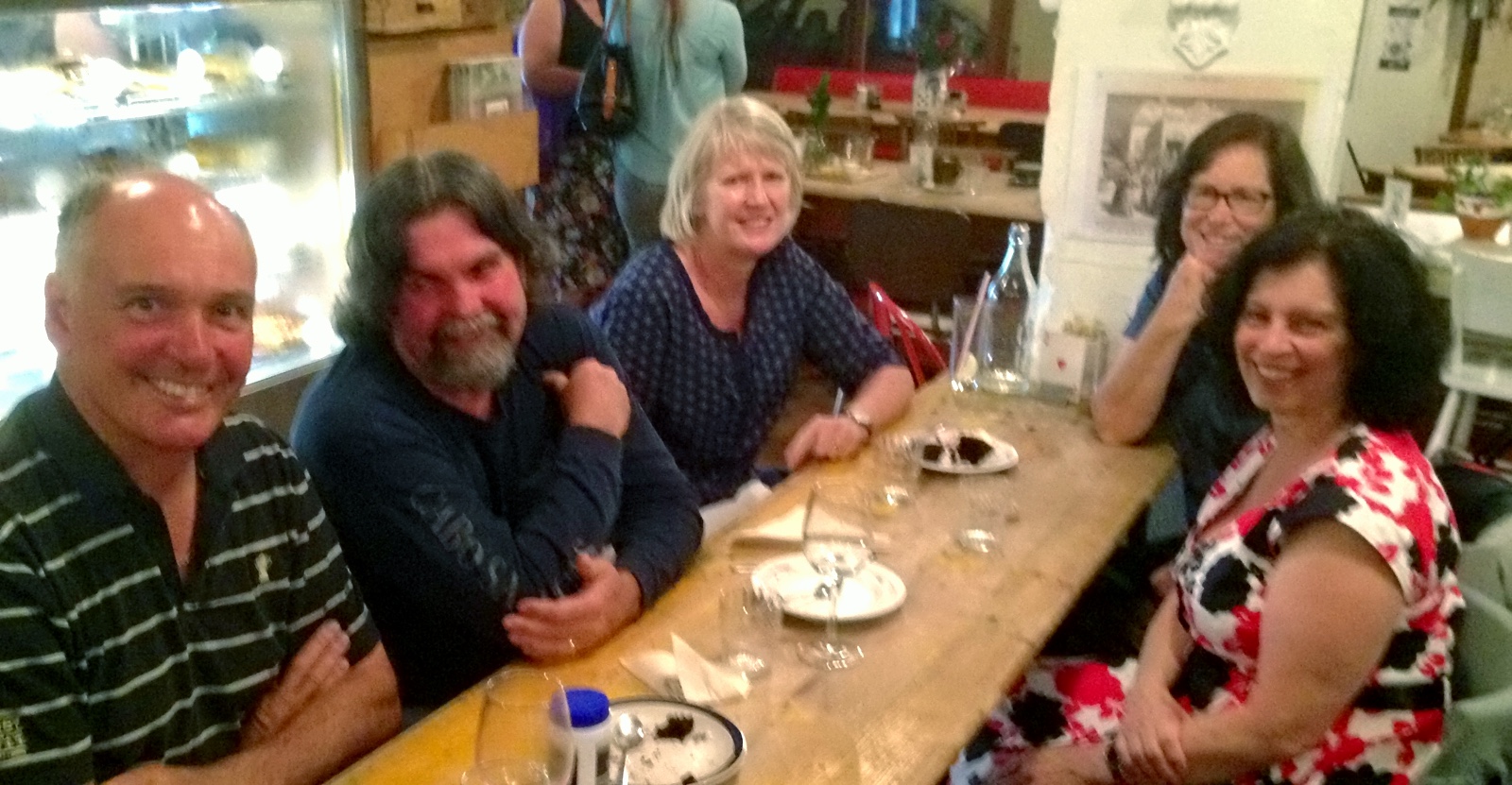 At the restaurant looking happy. L to R, Geoff, Mark, Geoffs wife Bev, Marks wife Tina and Fiona.