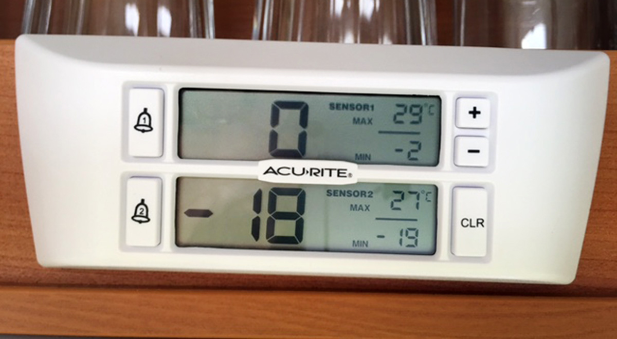 The top thermometer is 1 degree out. The correct reading is fridge -1, freezer -19.