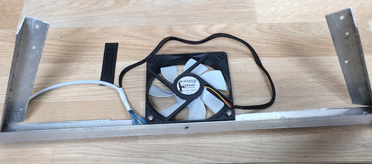 Through the LS300 vent aperture I lowered a 25x25mm aluminum angled bracket to 40mm below the condenser fins, then fixed to the side walls. The fan was then lowered and fitted to the alloy bracket (long screw driver needed).