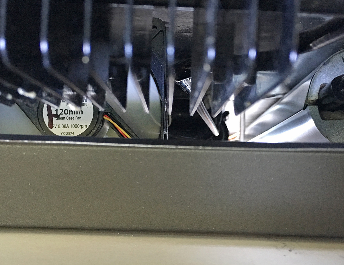 This photo shows the position of the baffle. The top edge is placed 10mm below the cooling fins. The cold air travelling up the tower is diverted onto the cooling fins.