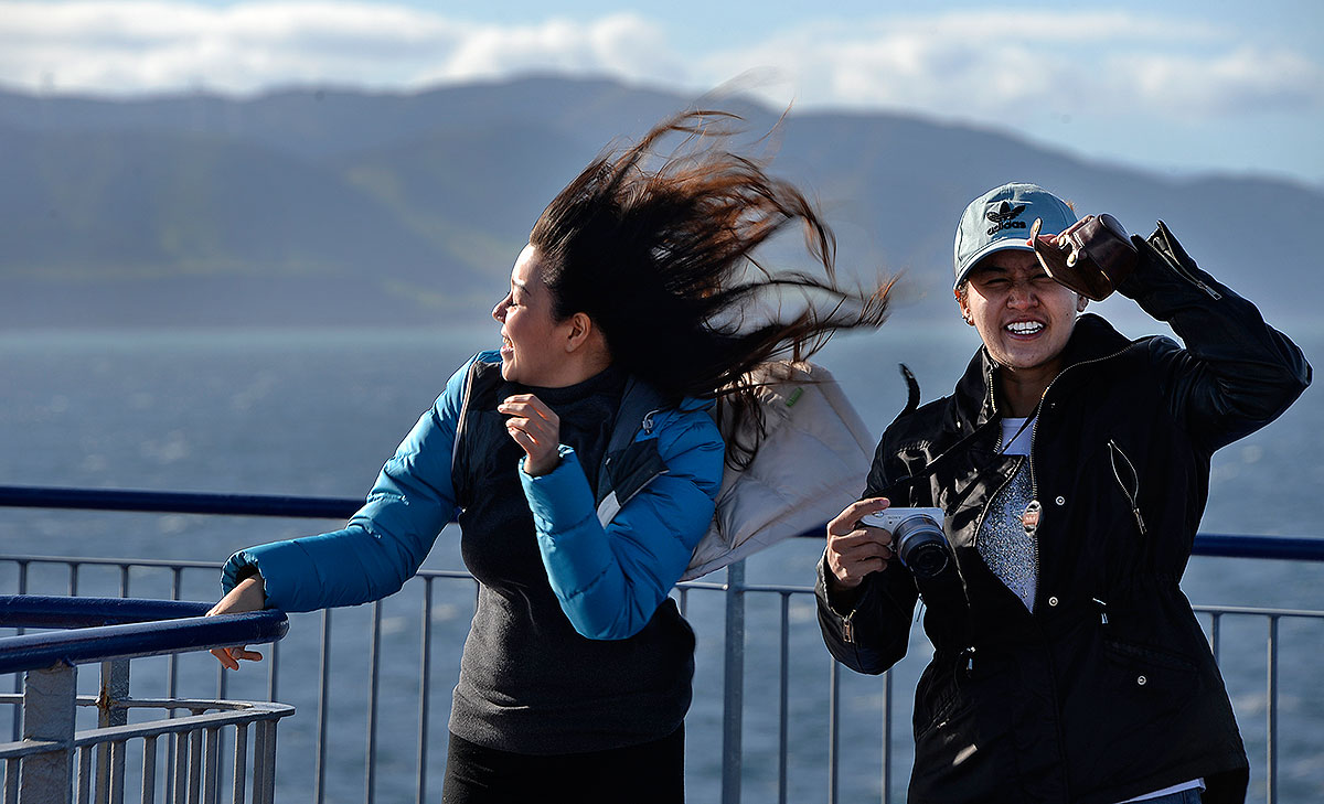 I went for a walk around the ship as we nearing the Tory Channel and there were a couple of girls up on the Observation deck trying to get pictures of each other in the wind. It was hilarious.